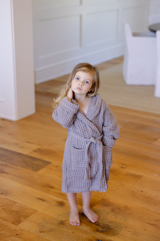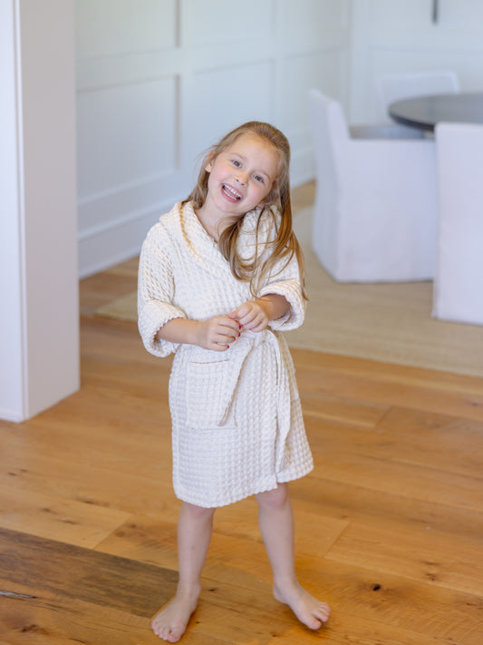Children’s robe made with 100% OEKO-TEX certified cotton waffle weave. Offered in a variety of colors, these soft, thick, quick-drying robes are super absorbent. Ever-so-gentle on sensitive skin, they are the perfect robes for those seeking to indulge their kiddos in luxurious comfort. Our robes offer the ultimate coziness and relaxation for your littles.