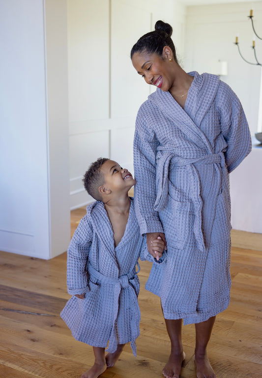 Matching organic, handcrafted, waffle mommy & me robes made with 100% OEKO-TEX certified cotton waffle weave. Offered in a variety of colors, these soft, thick, quick-drying bath robes are super absorbent. Ever-so-gentle on sensitive skin, they are the perfect gift for those seeking to indulge in luxurious comfort. Perfect for everyone in the family, this robe offers ultimate coziness and relaxation.